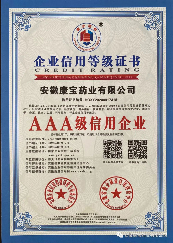 近日,安徽企業信用等級評價專家委員會公布了2020年“AAA級信用企業”評選結果,安徽康寶藥業有限公司喜獲“AAA級信用企業”榮譽稱號,為最高信用等級。